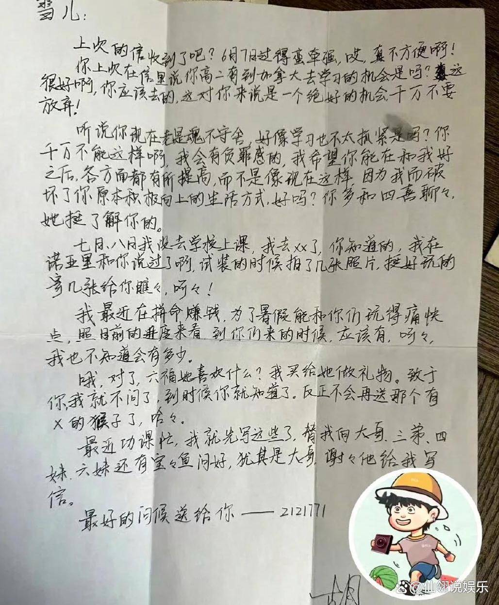2000年的胡歌正忙着备考上戏,课余时间靠拍广告攒零花钱。通过书信认识的雪儿在北京读高一,两人隔着千里用文字编织着懵懂的情愫。“这个暑假我一定要去北京见你”“我在努力赚钱,想给你买最喜欢的礼物”,信里的字迹带着少年特有的工整,末尾用“2121771”(谐音“爱你爱你亲亲你”)收尾的小心思,让网友直呼“DNA动了”。随信附上的两张照片更显珍贵:一张是穿运动服的他在篮球场上咧嘴笑,另一张试镜时的白色西装照,眉眼间还带着未脱的稚气。